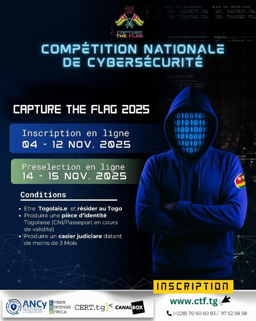 L’Agence Nationale de la Cybersécurité (ANCy) a lancé ce 4 novembre 2025, les inscriptions de la compétition nationale de cybersécurité ‘’Capture The Flag National 2025’’ (CTF 2025). La plateforme d’inscription www.ctf.tg est ouverte jusqu’au 12 novembre 2025. La phase de présélection en ligne se déroulera les 14 et 15 novembre, puis la grande finale en présentiel à Lomé les 28 et 29 novembre.